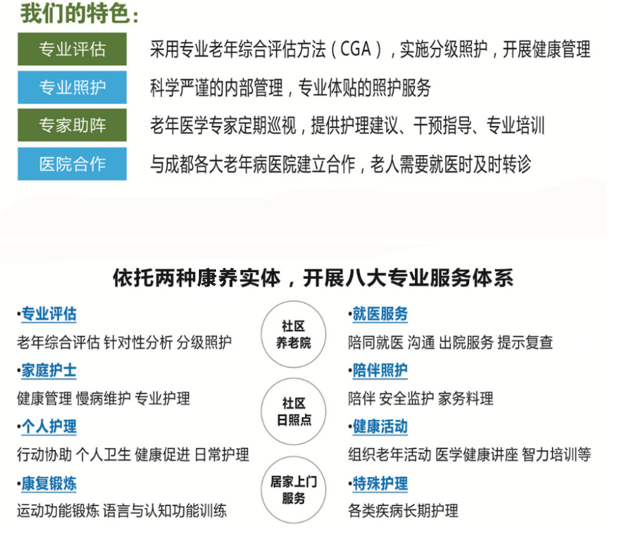 成都怡倍康養(yǎng)老服務(wù)有限公司是一家按照“康養(yǎng)結(jié)合”模式運營的專業(yè)化養(yǎng)老機構(gòu)。我們與四川大學華西醫(yī)院老年醫(yī)學中心合作,專注于社區(qū)養(yǎng)老,并在實踐中堅持關(guān)注老年人身心健康。